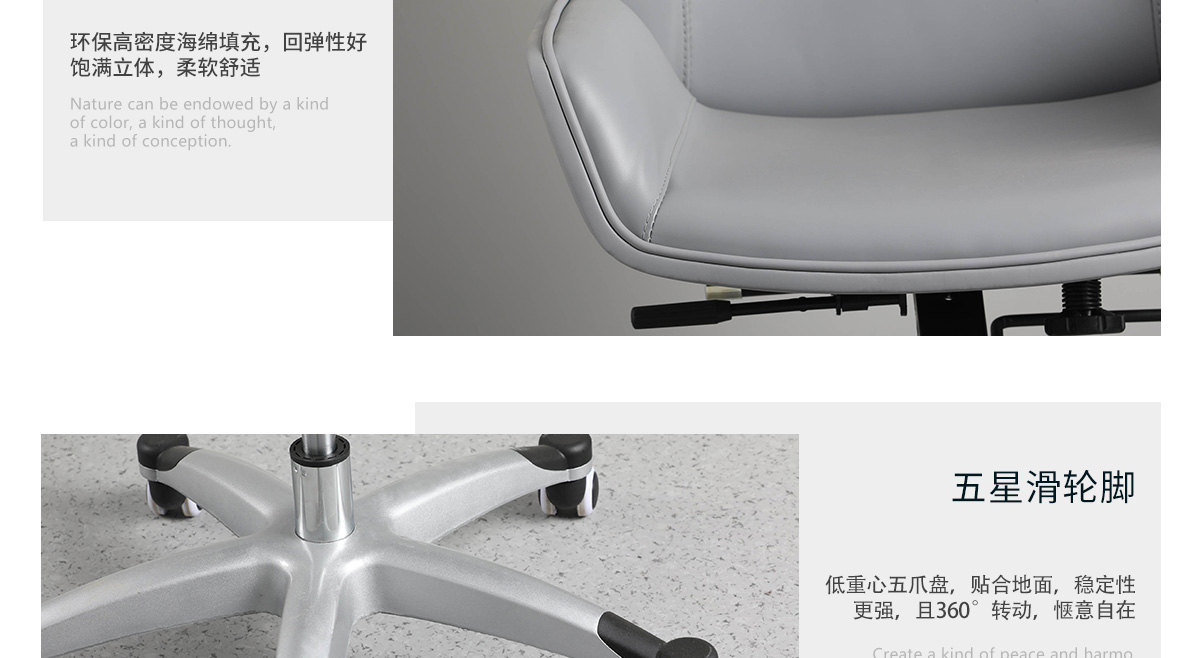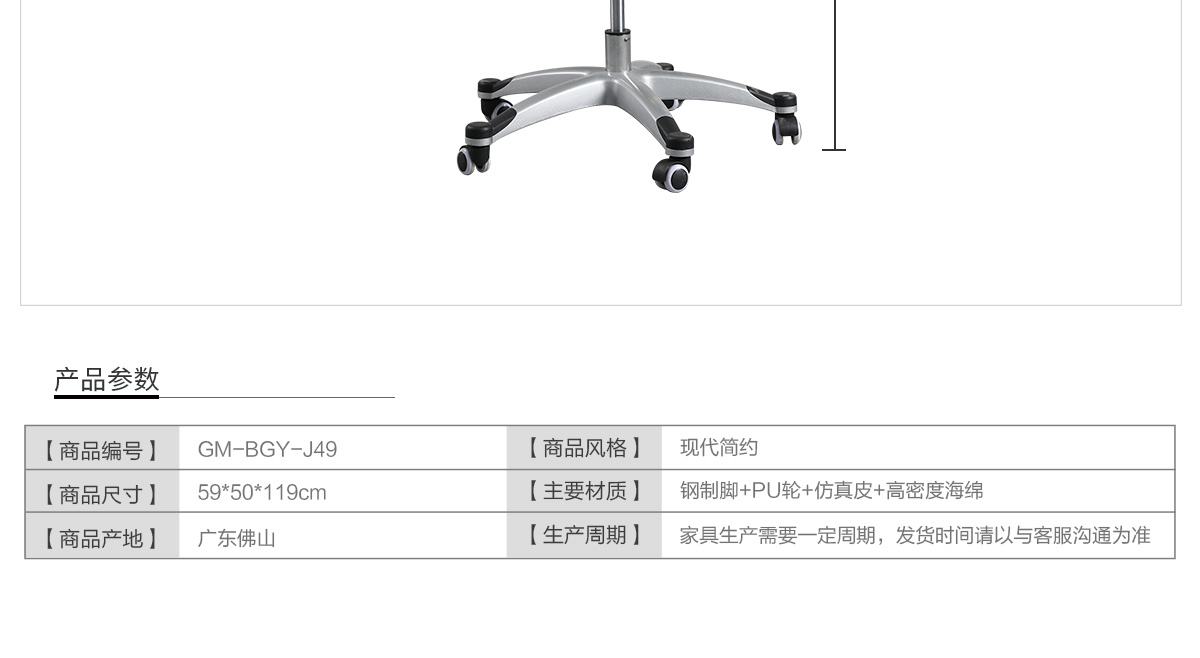 五星腳材質(zhì):電鍍鋼制腳+抗摔防滑PU輪