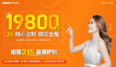 柜貓家居特別推出“19800健康定制筑新家”主題活動(dòng),全屋定制僅需19800,品質(zhì)木門、高品質(zhì)櫥柜免費(fèi)送。