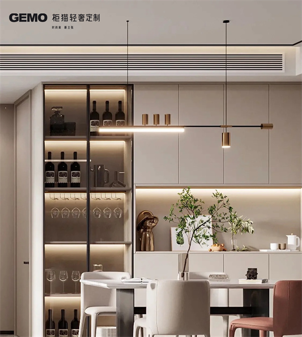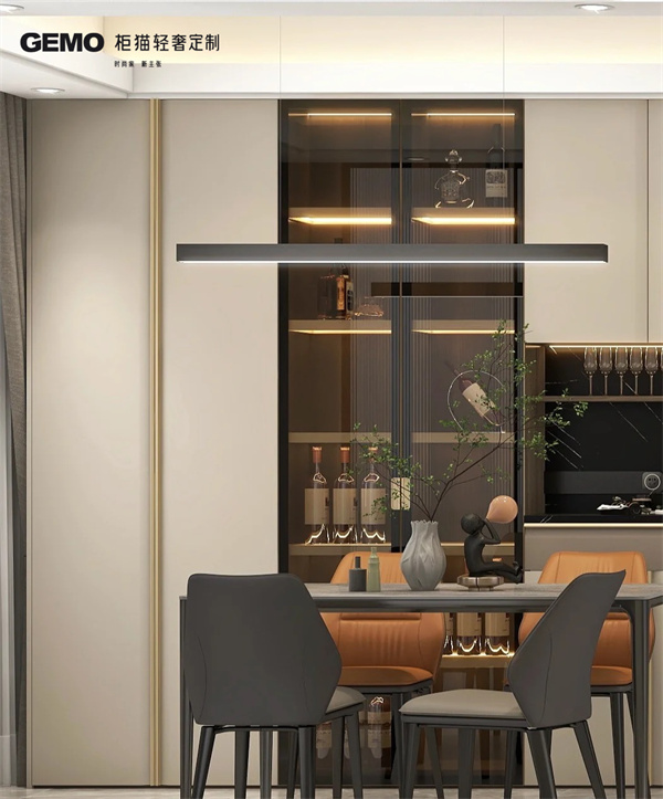 第二,柜體結(jié)構(gòu)。柜子不要做上下一樣長,會(huì)顯得頭重腳輕,下柜比上柜稍微長一些會(huì)更協(xié)調(diào),不建議做酒格,老氣又過時(shí)。如果實(shí)在有展示需求的話,可以做一豎排的茶色玻璃門,去陳列飾品或者紅酒都很出效果。
