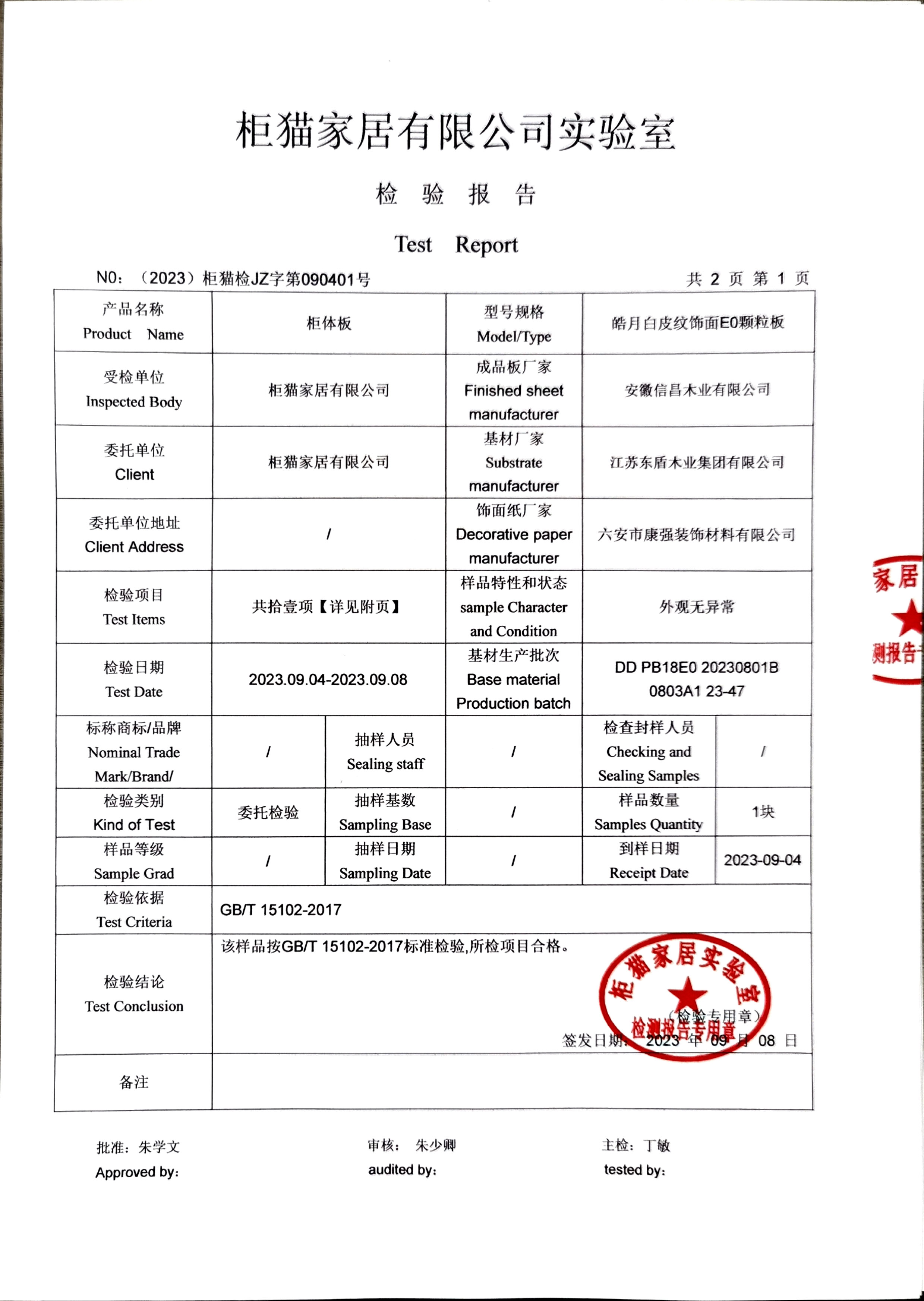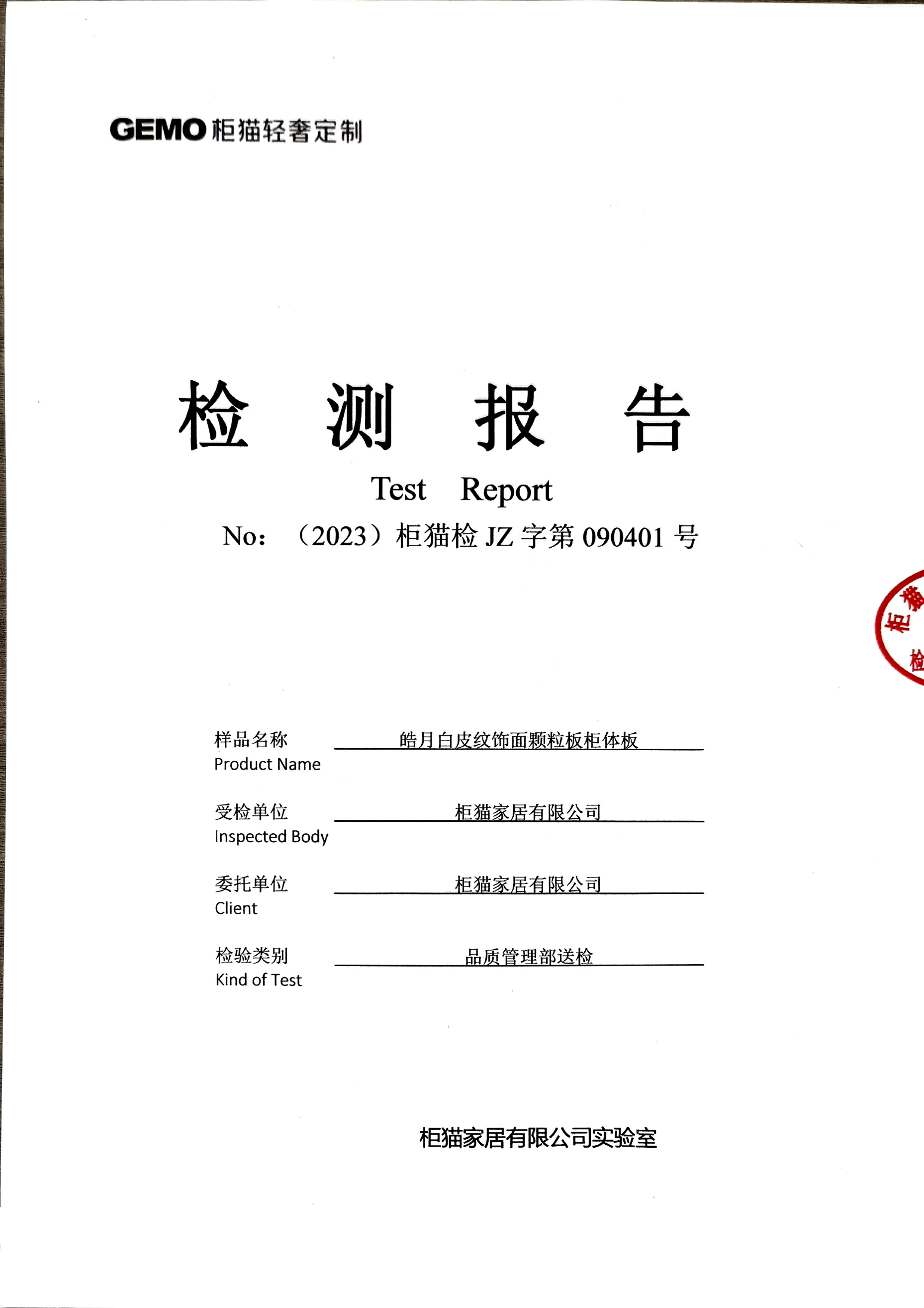 柜貓輕奢定制 2023年9月皓月白皮紋飾面顆粒板柜體板實(shí)驗(yàn)室檢測(cè)報(bào)告