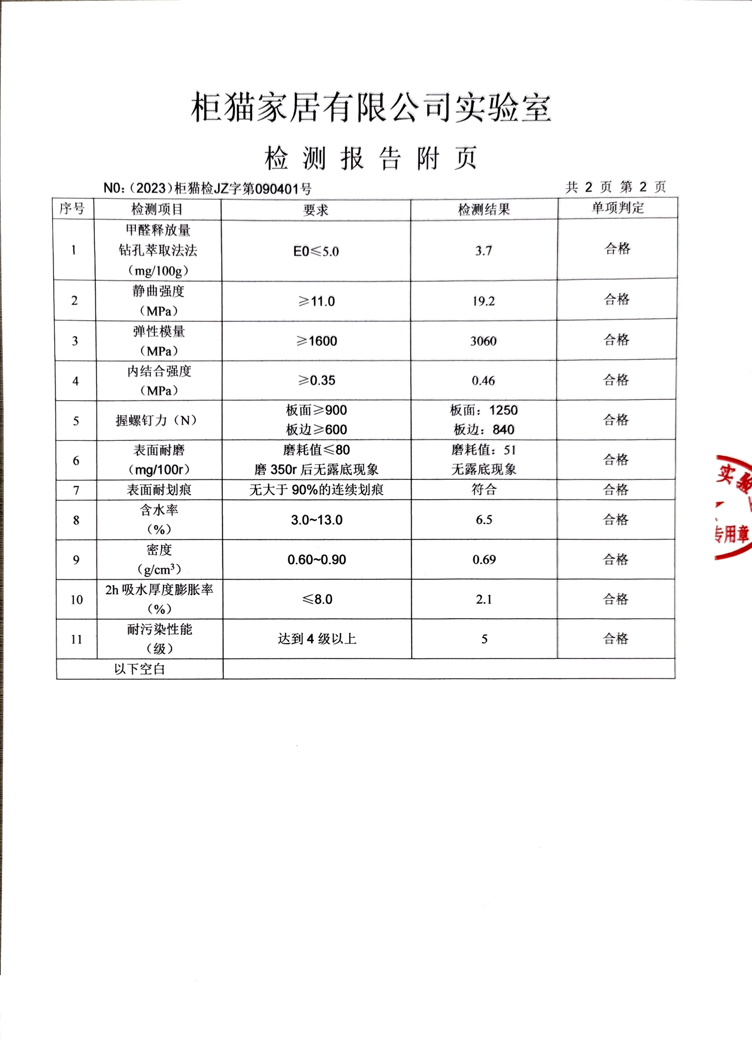 柜貓輕奢定制 2023年5月卡特灰飾面顆粒板柜體板實(shí)驗(yàn)室檢測(cè)報(bào)告
