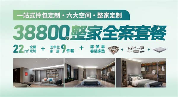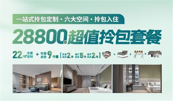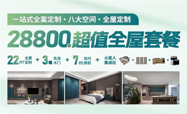 28800元的套餐有兩種選擇。第一種是超值全屋套餐,有22m2的全屋定制+3樘免漆木門+7m現(xiàn)代櫥柜+火星人集成灶;第二種是超值拎包套餐,22m2的全屋定制+柜貓家居9件套(臥室家具兩件、餐廳家具5件、客廳家具兩件),相同的價(jià)格,不同的活動(dòng),可以任意挑選。